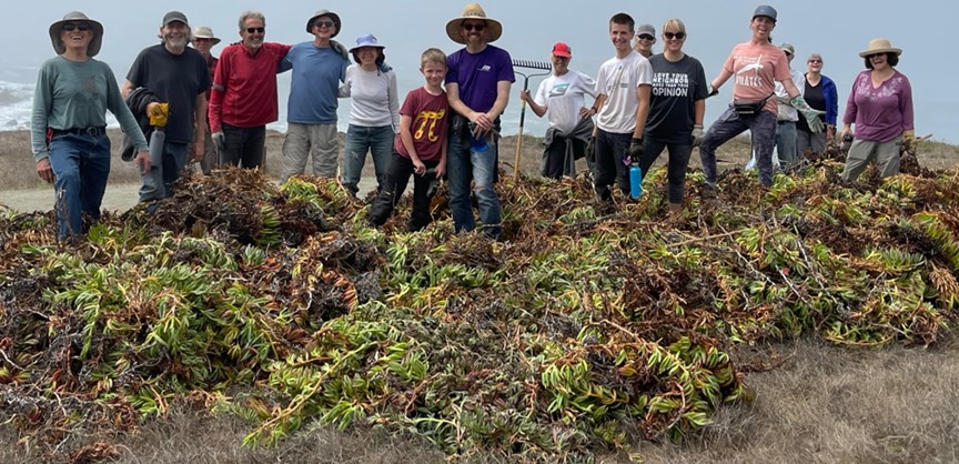 Volunteers on Fiscalini Ranch Preserve will gather at 9 a.m. on Saturday, May 18, to work with local nature by removing invasive South African ice plant from our bluffs. Their work will make way for seaside daisy, seaside wooly sunflower, sea cliff buckwheat, and sea pinks, among other native plants that make the Ranch so special.